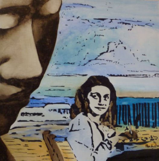 "Anne aan zee, golven omringen haar, gelukkig achter haar schrijf tafeltje.